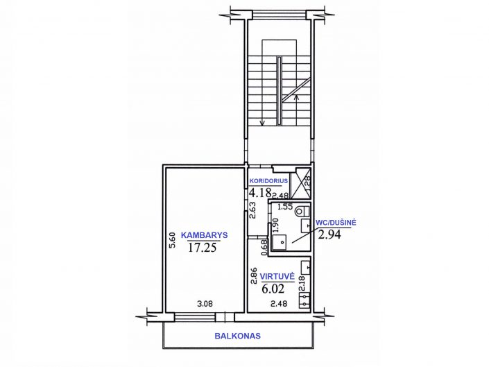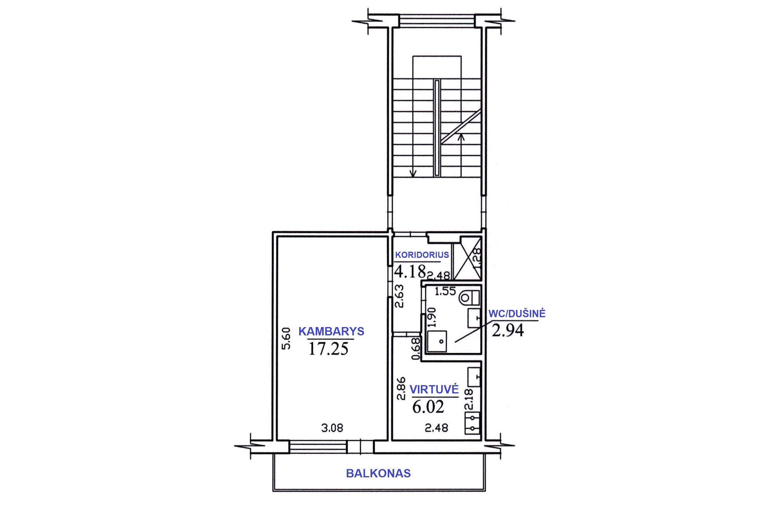 Bendras plotas – 30,39 kv. m (koridorius – 4,18 kv. m, virtuvė – 6,02 kv. m, kambarys – 17,25 kv. m, dušinė su WC – 2,94 kv. m);