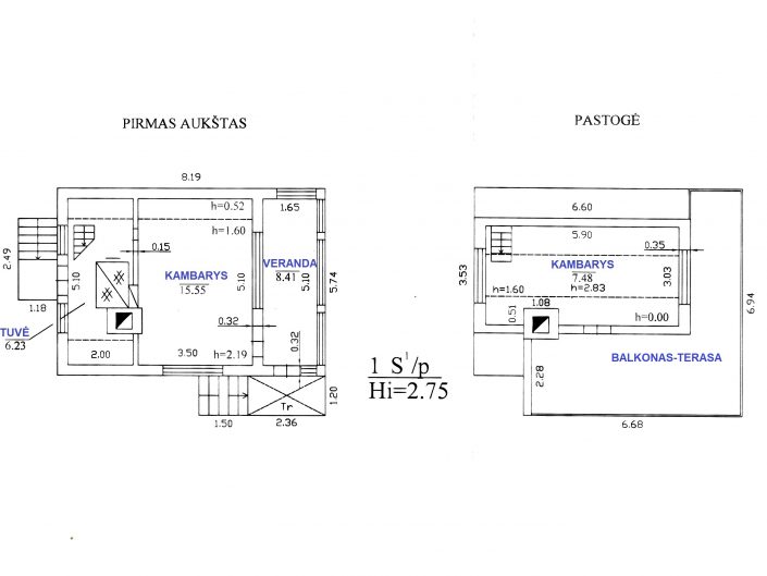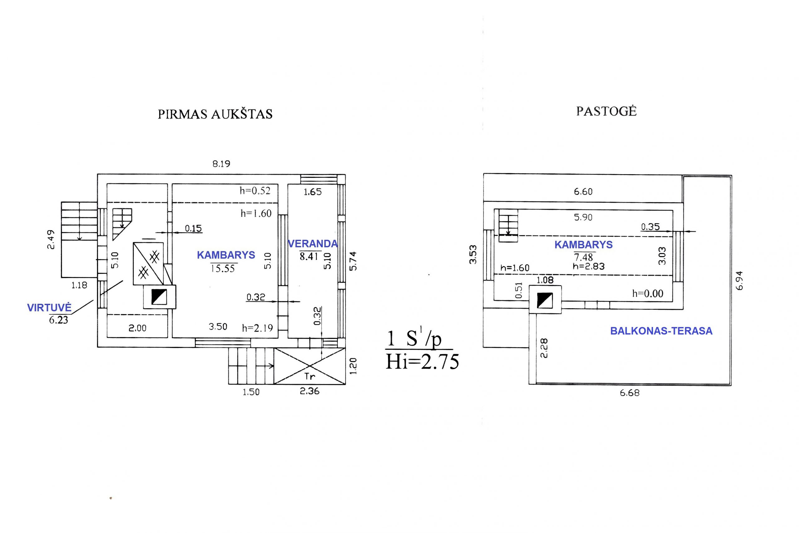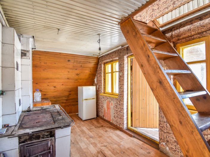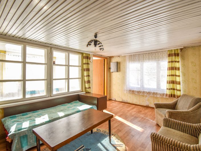 Pirmas aukštas: veranda – 8,41 kv. m, kambarys – 15,55 kv. m ir virtuvė – 6,23 kv. m;
